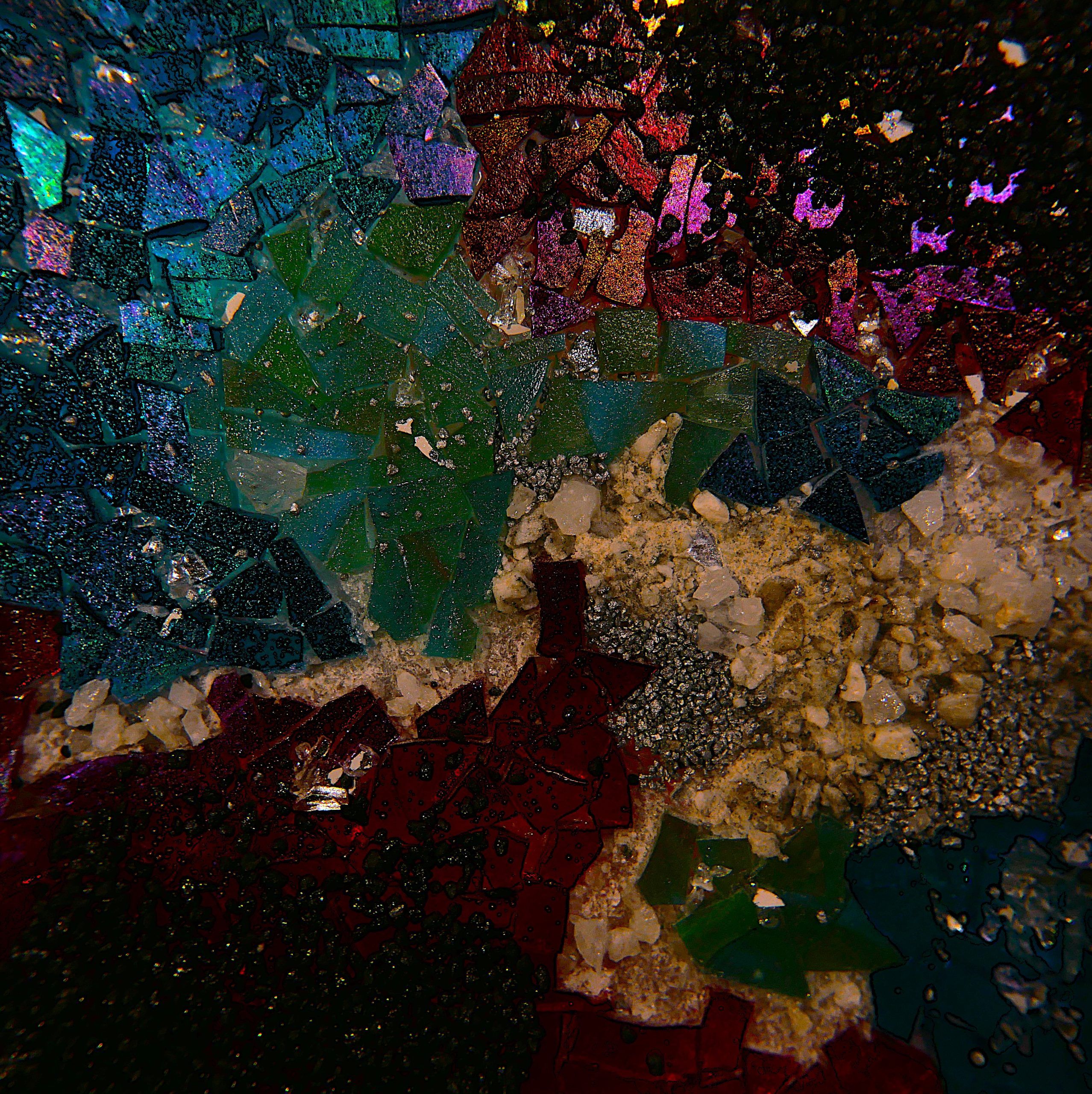 Close-up of nebula featuring red, blue and green iridescent stained glass, Savoy gneiss and Moretown quartz.