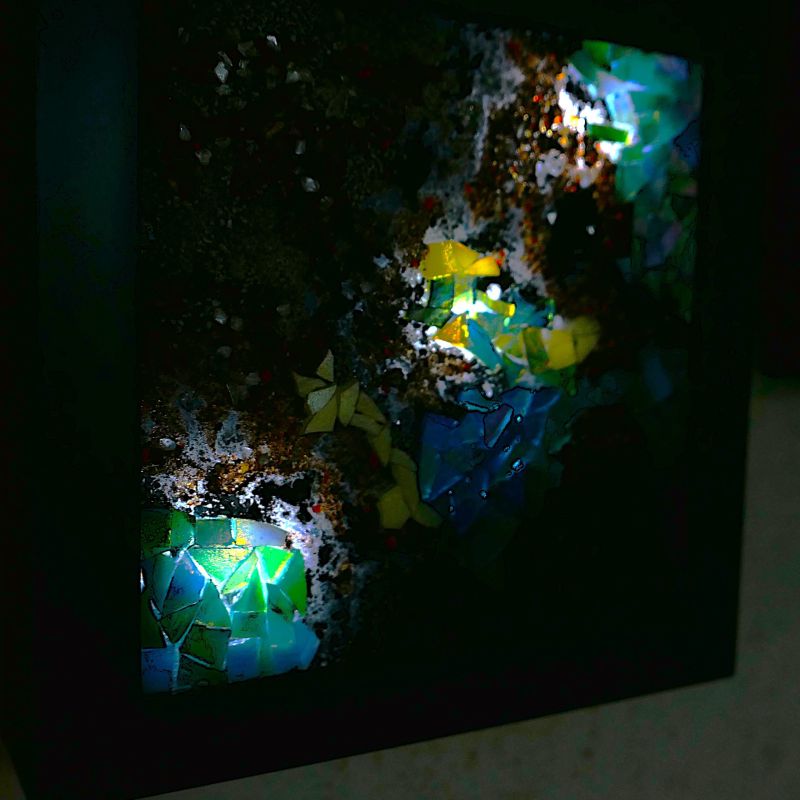 Each shadow box upon which the mosaic elements are arranged is illuminated from within by small light sources. Although a remote controller changes light color, intensity and pattern, the works are prepared by the artist with light as an integral part of the design. In a darkened room they take on a different character in contrast to natural sunlight.