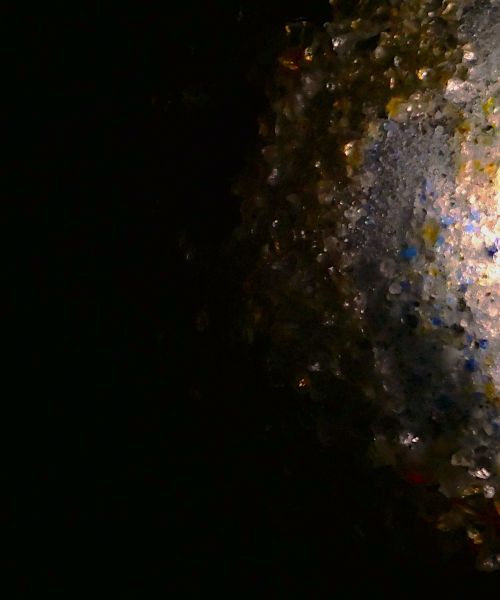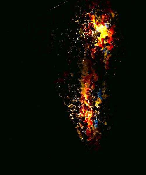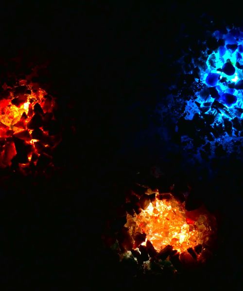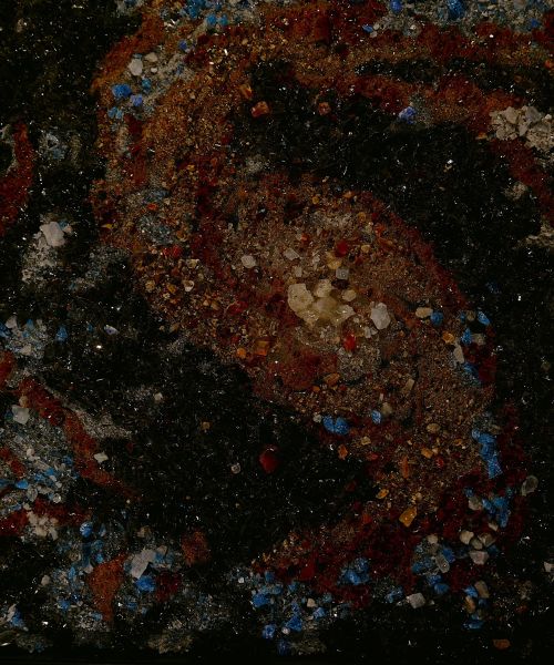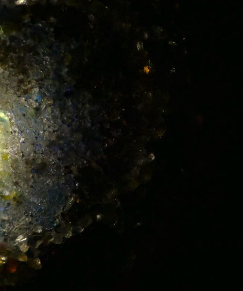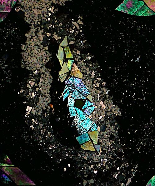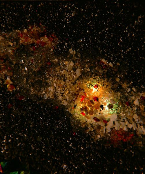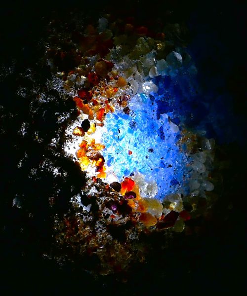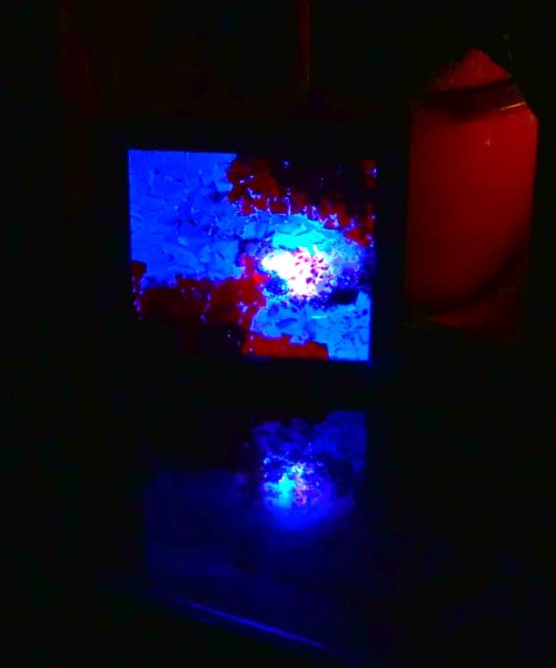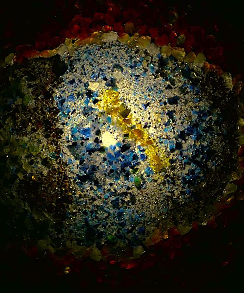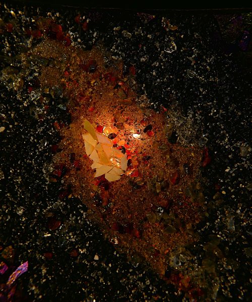 Black and blue iradescent stained glass, uncut Ruby (main star), Labradorite, Carnelian, Savoy Gneiss and other stone dust, illuminated with one light. Private collection in Pittsburgh, PA.
