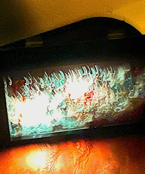 Image with illumination – blue light in upper right and yellow in lower left. Picture taken with interior lighting (reflected in stained glass mosaic) on overcast day.