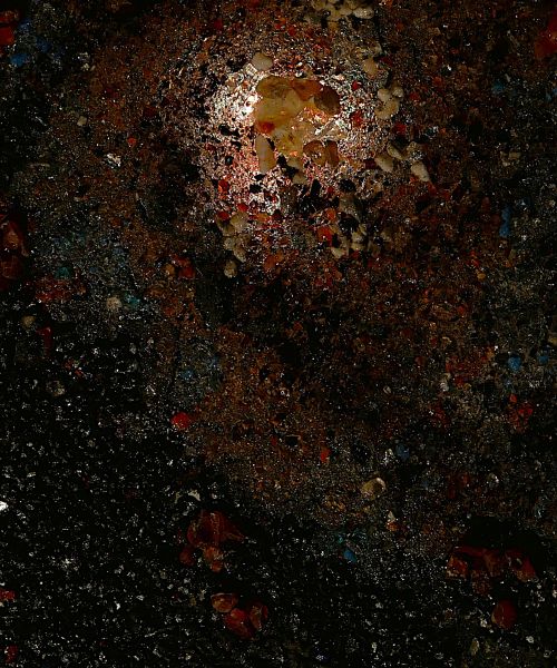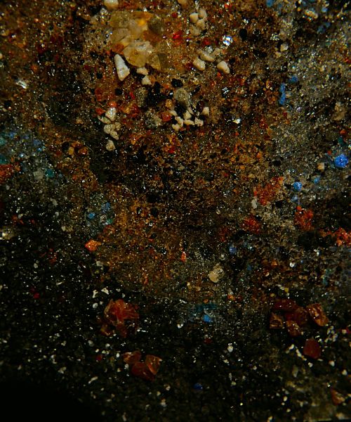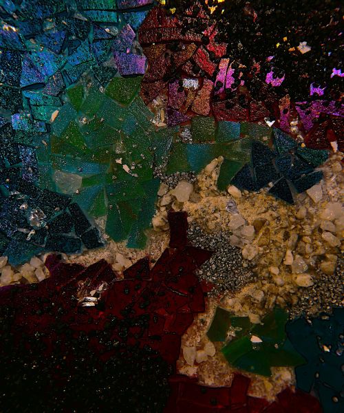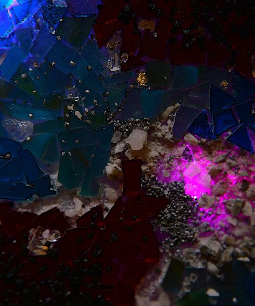 Oblique view with low-intensity yellow lighting. Multi-shade Carnelian, red-purple Garnet and crushed blue glass tile predominate. Red Ruby is visible at lower center