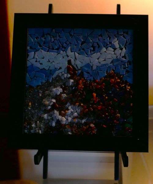 The mosaic is set within a 7″x 7″ shadow box which can be either hung on a wall or set atop furniture (shown here) or on a shelf.