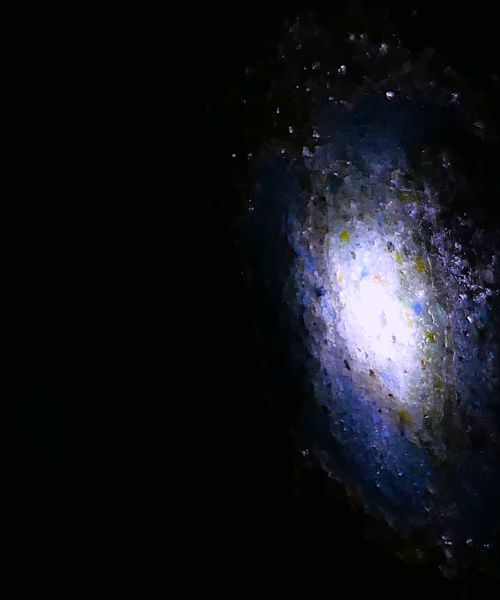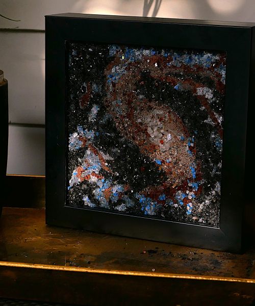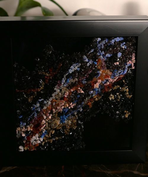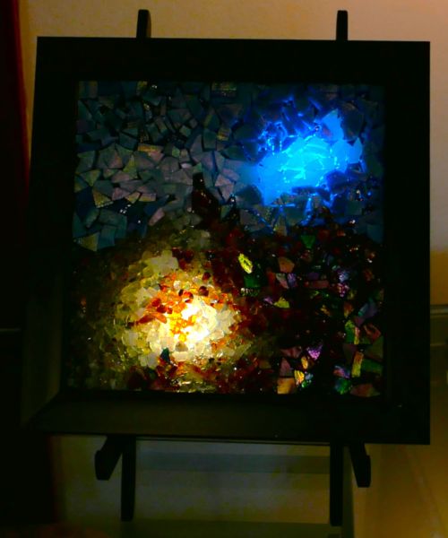 The telescope image required nearly 700 digital exposures. The mosaic piece uses crushed blue glass tiles, Obsidian, Rhodonite, Citrine, Carnelian, Moretown Quartz, and Sugarloaf sedimentary stone, 5X7 frame, three lights