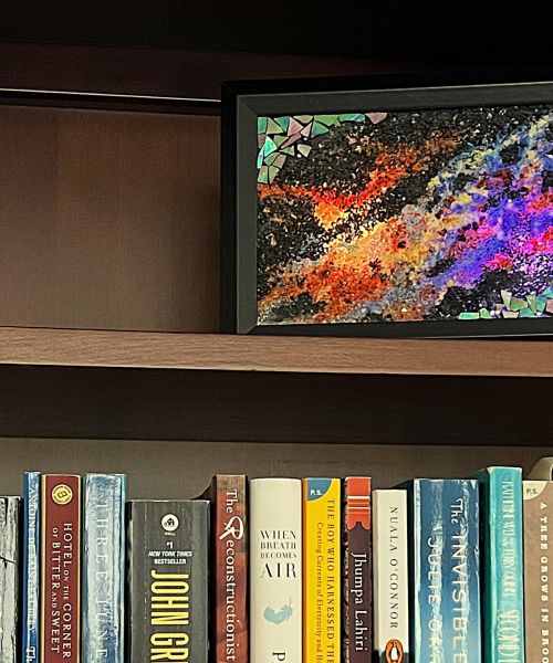 A dimly lit bookshelf makes an ideal place to display and illuminate at near eye level any mosaic space art piece.