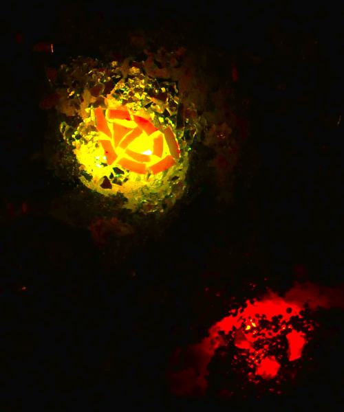 Illuminated image including black iradescent stained glass in two corners, Labradorite, crushed Carnelian and Garnet gemstones, One light in 7″ x 7″ black frame. Private collection in Washington, D.C.